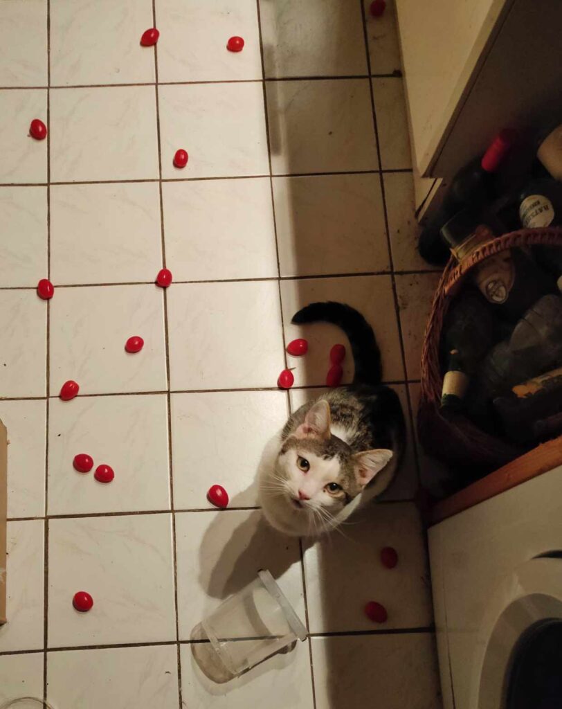 Fritte hatte inzwischen schon alle Tüten kurz kontrolliert und einen kleinen Haufen von Lebensmitteln gebildet, die er sich noch genauer anschauen wollte. Die dicke Frau guckte kurz: „Haferflocken, Möhren, Äpfel, Hafermilch, vegane Klopse, Käse… Fritti, was willst du denn mit der Scheuermilch?“